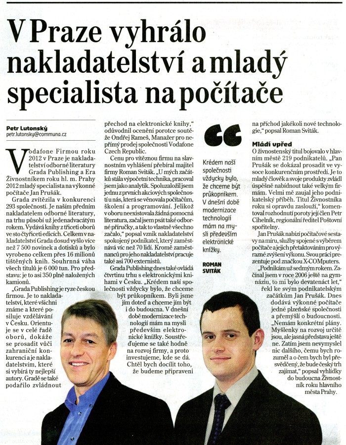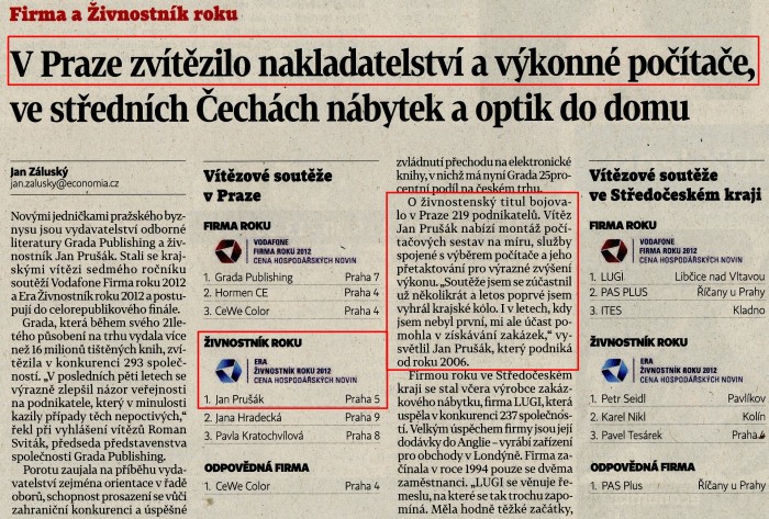 V Hospodářských novinách vyšel článek o naší výhře pražského finále soutěže Živnostník roku.