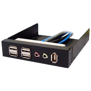 Rozšiřující panel (3,5") vyvádí čtyři USB 2.0 konektory, jeden Firewire konektor a audio konektory ze základní desky na čelo skříně pro dobrou dostupnost.