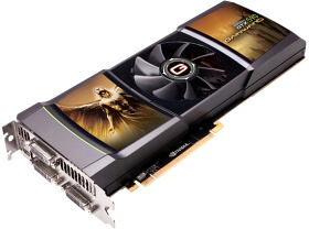 Nejvýkonnější grafická karta současnosti, která podporuje nVidia 3D Vision Surround a bez problémů spustí nejnovější hry na maximální detaily. Podporuje nejnovější DirectX11, samozřejmostí je pak hardwarová akcelerace videa i HDMI se zvukem pro připojení televize. Je možné na ni připojit až 3 zobrazovací zařízení zároveň pomocí digitálních konektorů pro ostrý obraz (2x DVI, 1x miniHDMI na každé kartě, využitelné maximálně 2 z každé karty). S kompatibilními brýlemi a monitorem je možné využít schopnosti panoramatického 3D zobrazení. Jedná se o dvoujádrovou grafickou kartu. Vyžaduje aspoň 650w zdroj.
